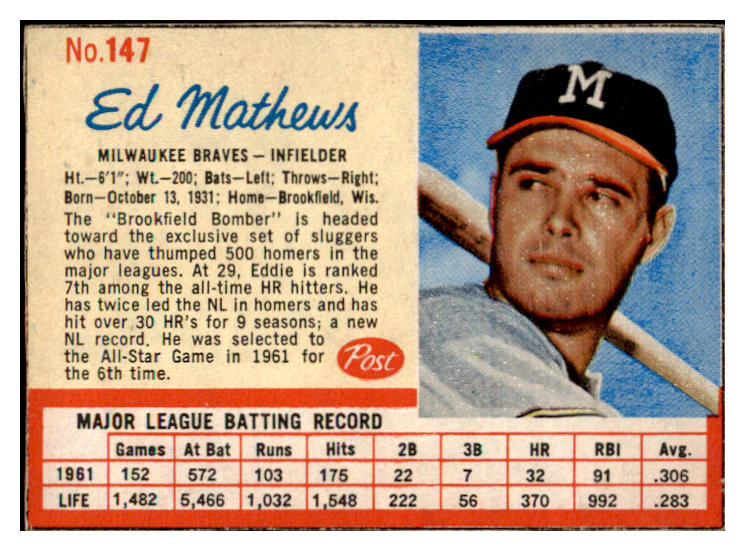 1962 Post Baseball #147 Eddie Mathews Braves EX-MT 513619