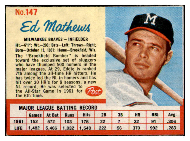 1962 Post Baseball #147 Eddie Mathews Braves EX-MT 513622