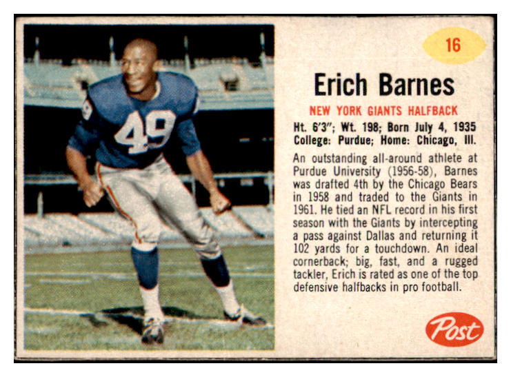 1962 Post Football #016 Erich Barnes Giants EX 529344