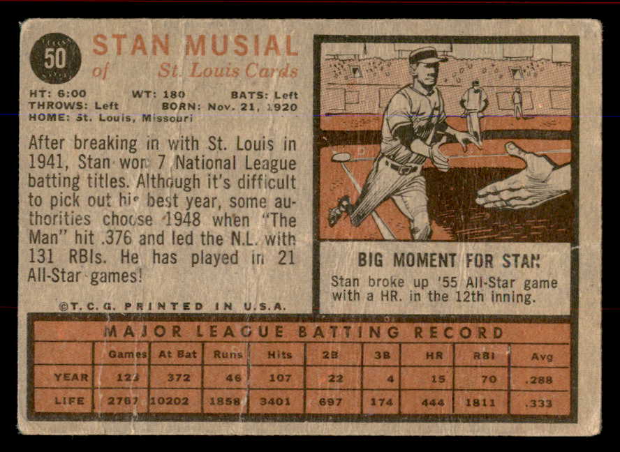 1962 Topps Baseball #050 Stan Musial Cardinals Fair 545487