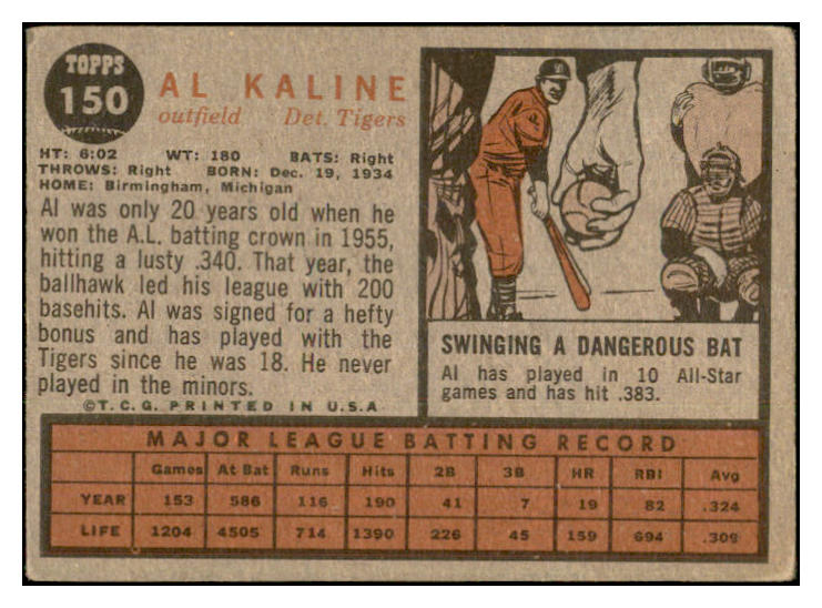 1962 Topps Baseball #150 Al Kaline Tigers VG 534463