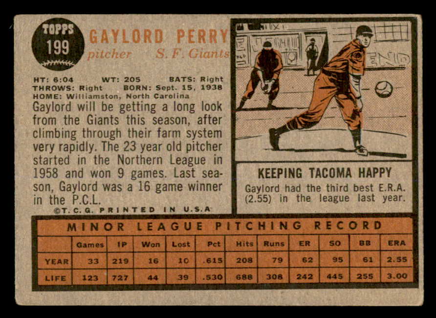 1962 Topps Baseball #199 Gaylord Perry Giants VG-EX 539356