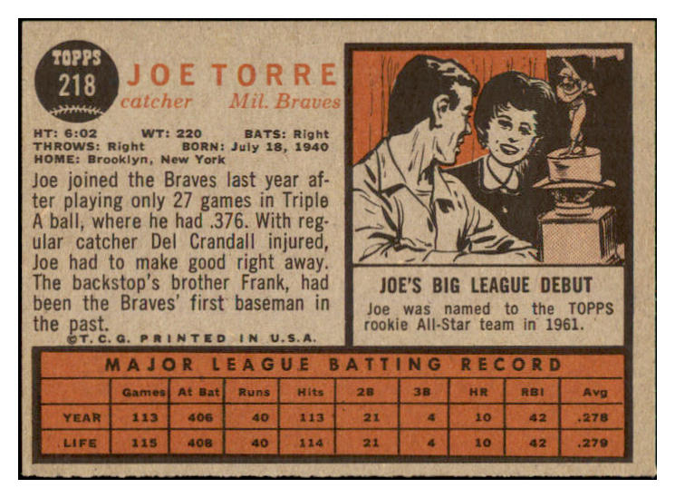 1962 Topps Baseball #218 Joe Torre Braves EX-MT 531043