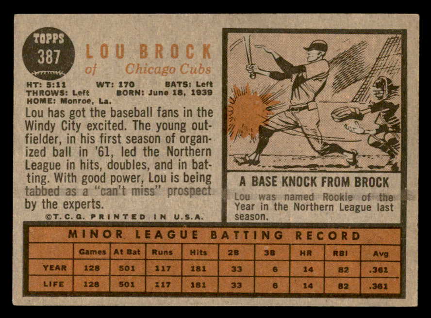 1962 Topps Baseball #387 Lou Brock Cubs EX 544580