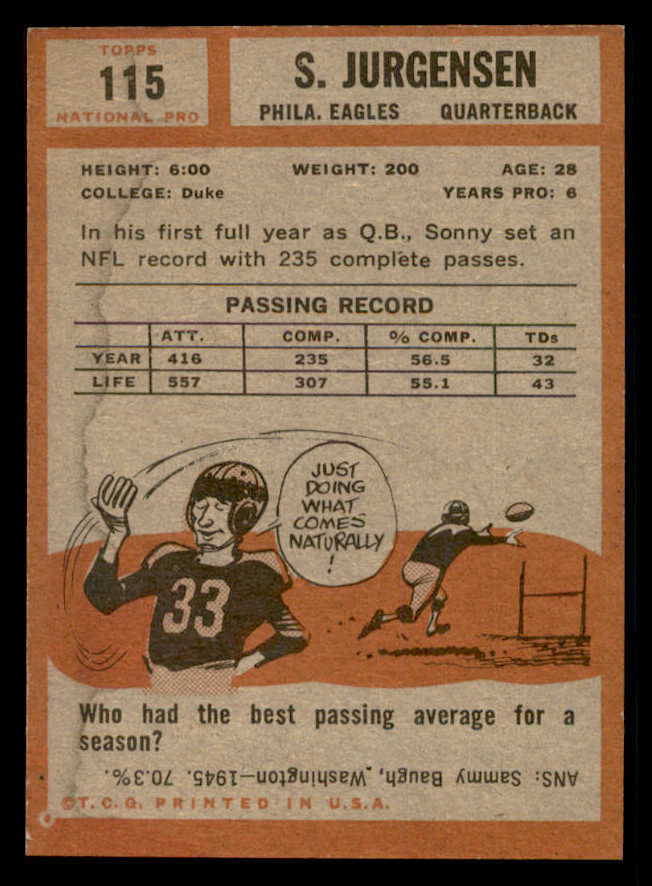 1962 Topps Football #115 Sonny Jurgensen Eagles VG stain back 542406