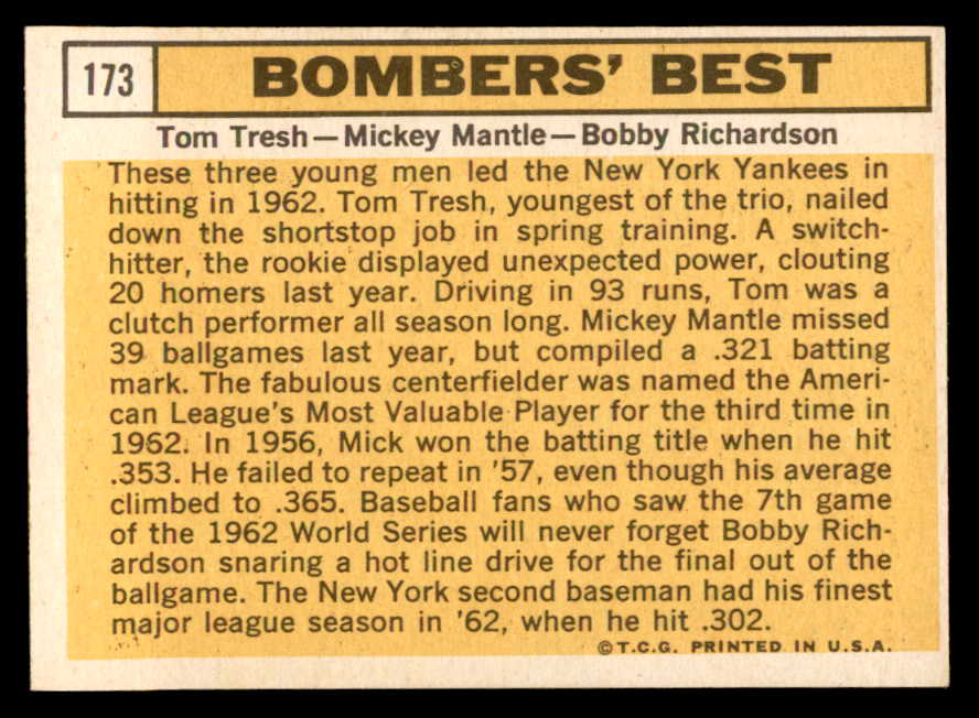 1963 Topps Baseball #173 Mickey Mantle Bobby Richardson EX 540566