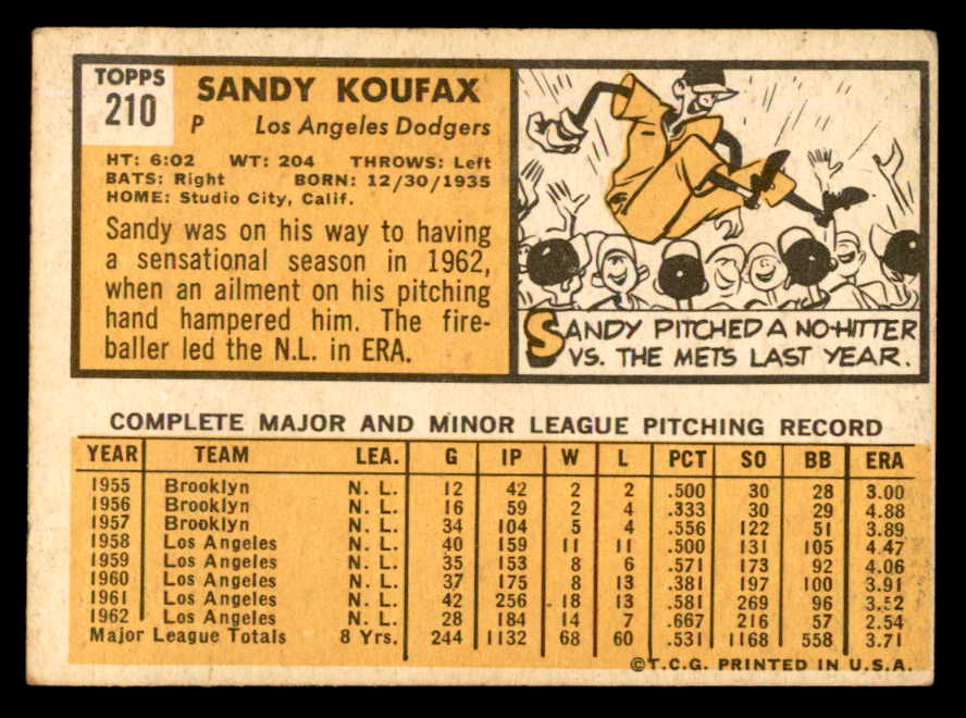1963 Topps Baseball #210 Sandy Koufax Dodgers VG-EX 540631