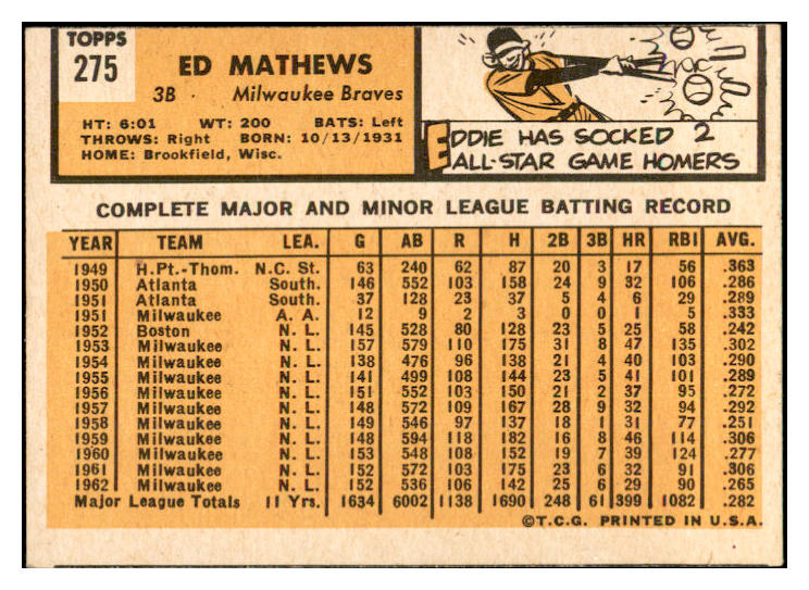 1963 Topps Baseball #275 Eddie Mathews Braves EX 534283