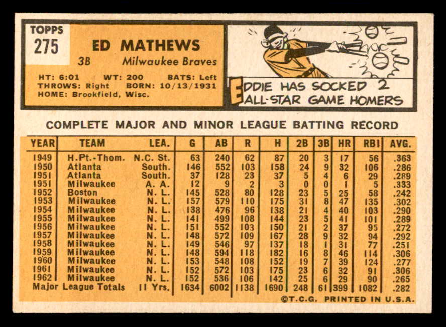 1963 Topps Baseball #275 Eddie Mathews Braves EX+/EX-MT 540656