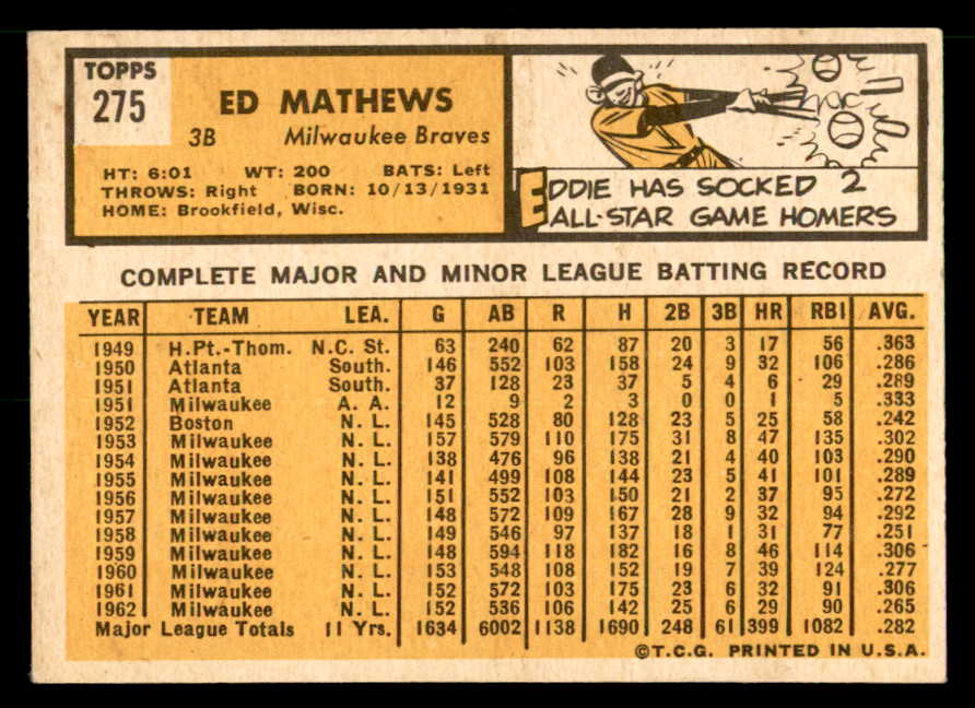 1963 Topps Baseball #275 Eddie Mathews Braves EX-MT 539672