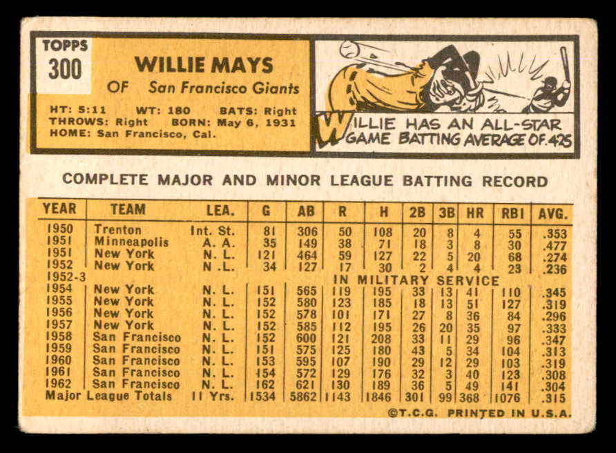 1963 Topps Baseball #300 Willie Mays Giants VG 540575