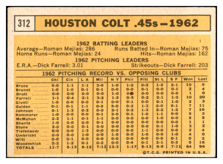 1963 Topps Baseball #312 Houston Colt .45s Team EX 534357