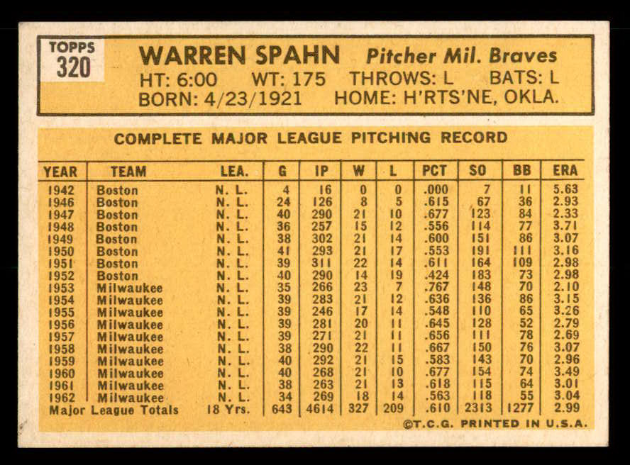 1963 Topps Baseball #320 Warren Spahn Braves EX-MT 539689