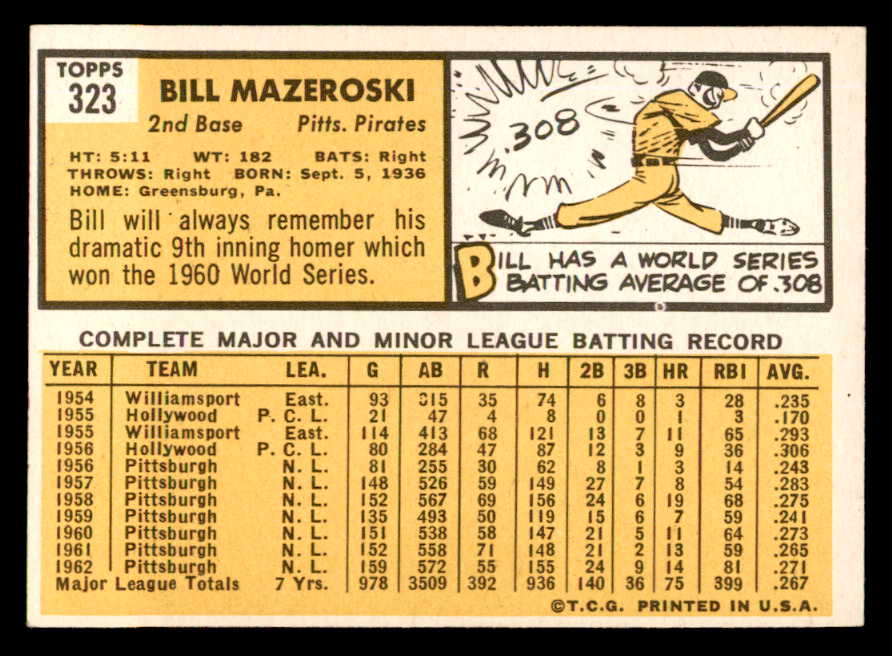 1963 Topps Baseball #323 Bill Mazeroski Pirates NR-MT 540573