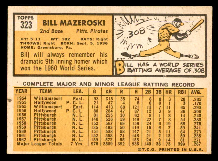 1963 Topps Baseball #323 Bill Mazeroski Pirates NR-MT 540615
