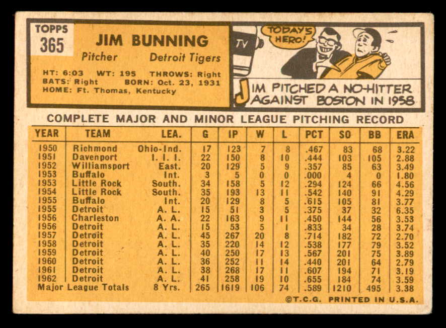 1963 Topps Baseball #365 Jim Bunning Tigers VG-EX 540555