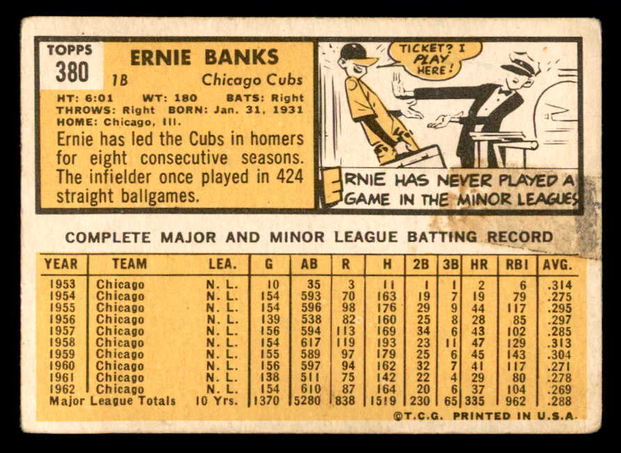 1963 Topps Baseball #380 Ernie Banks Cubs Poor 540669