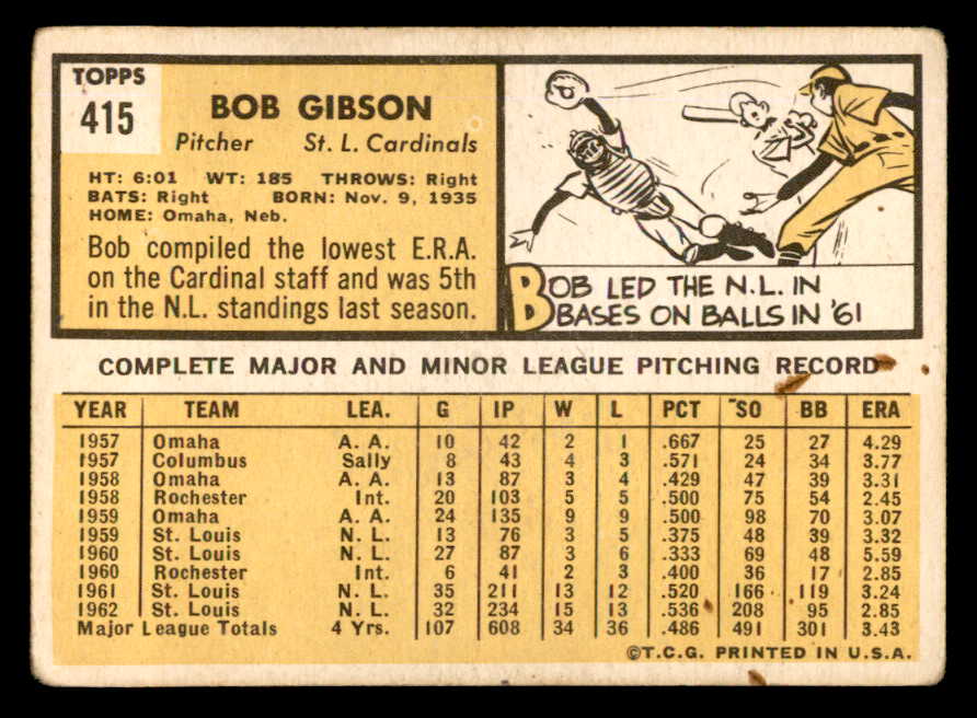 1963 Topps Baseball #415 Bob Gibson Cardinals VG 540632