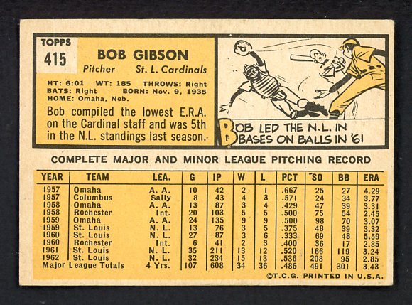 1963 Topps Baseball #415 Bob Gibson Cardinals VG-EX 540634