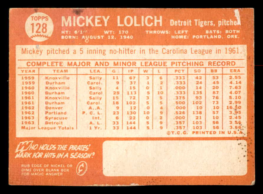 1964 Topps Baseball #128 Mickey Lolich Tigers VG 540757