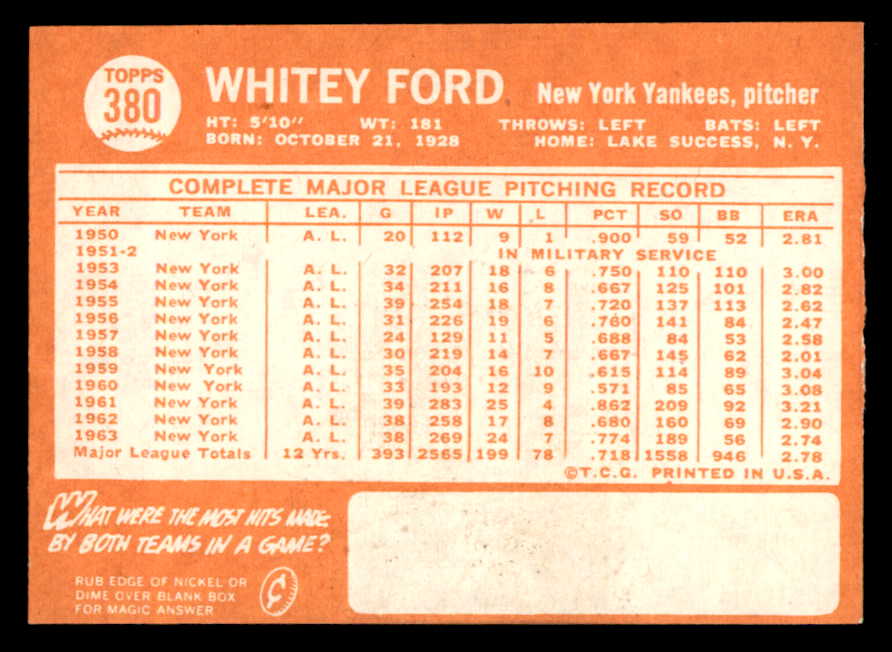 1964 Topps Baseball #380 Whitey Ford Yankees EX-MT 544603