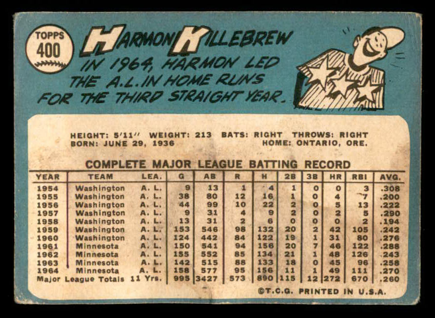 1965 Topps Baseball #400 Harmon Killebrew Twins FR-GD 544609