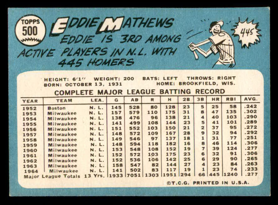 1965 Topps Baseball #500 Eddie Mathews Braves VG-EX 544628