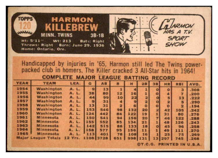 1966 Topps Baseball #120 Harmon Killebrew Twins VG-EX 531306