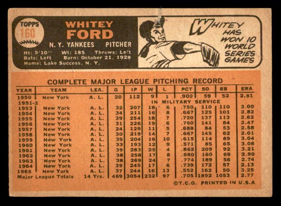 1966 Topps Baseball #160 Whitey Ford Yankees FR-GD 540869