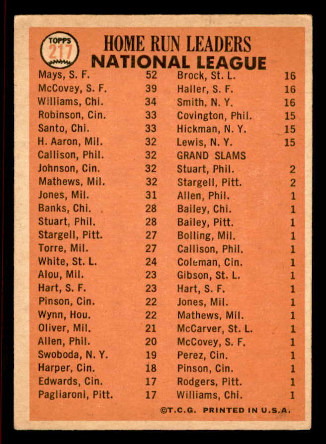 1966 Topps Baseball #217 N.L. Home Run Leaders Willie Mays VG-EX 542085