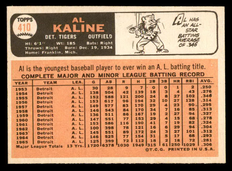 1966 Topps Baseball #410 Al Kaline Tigers EX-MT 544549