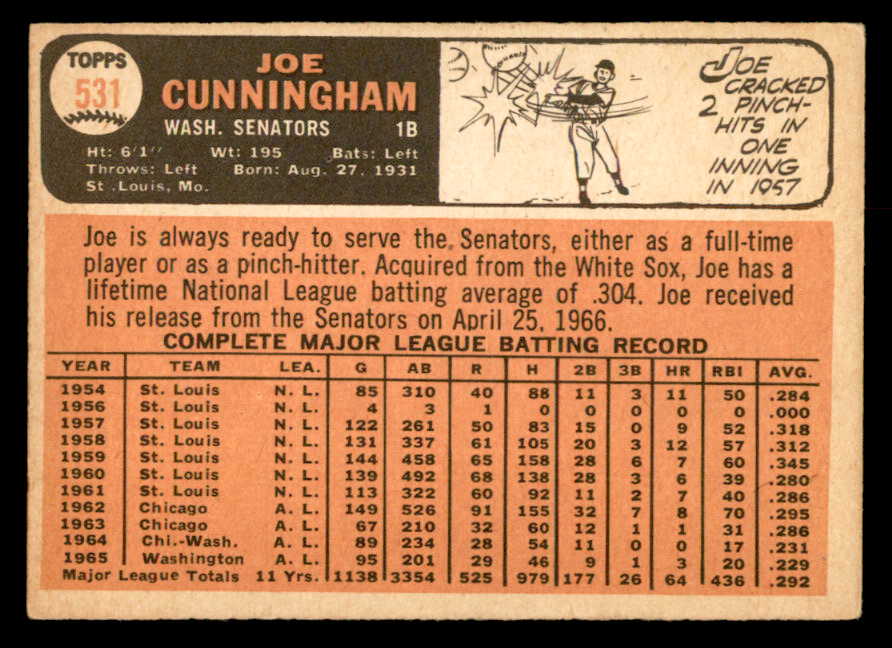 1966 Topps Baseball #531 Joe Cunningham Senators EX 544439