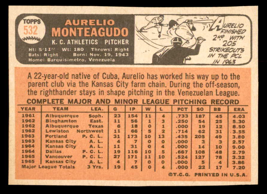 1966 Topps Baseball #532 Aurelio Monteagudo A's EX-MT 544440