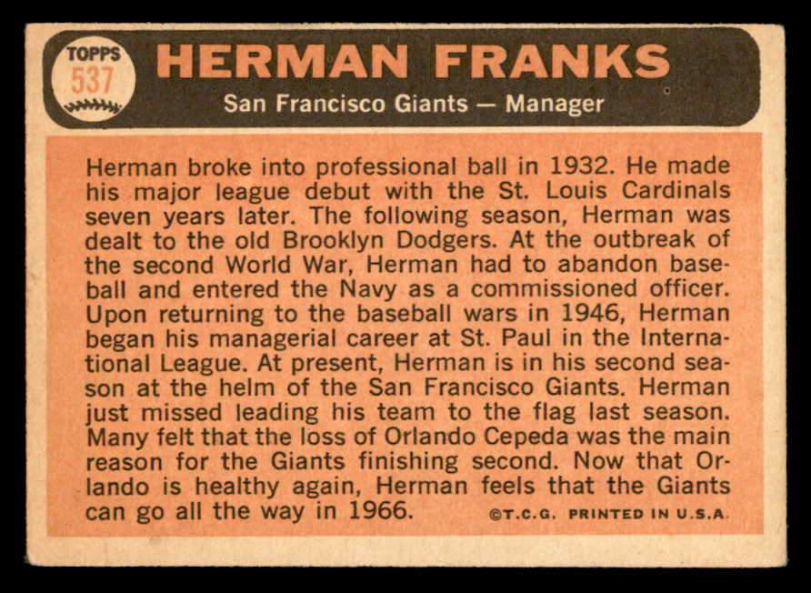 1966 Topps Baseball #537 Herman Franks Giants VG-EX 544450