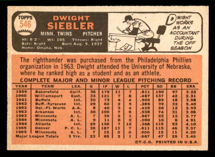1966 Topps Baseball #546 Dwight Siebler Twins EX+/EX-MT 544465