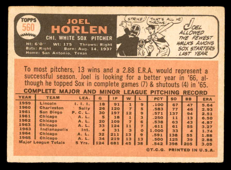 1966 Topps Baseball #560 Joel Horlen White Sox VG-EX 544488
