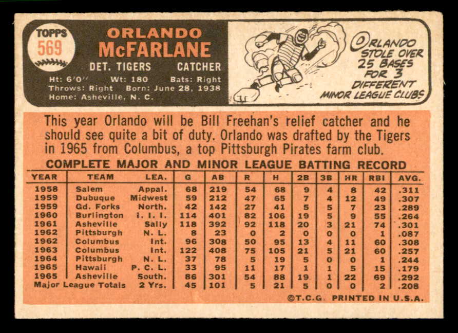 1966 Topps Baseball #569 Orlando McFarlane Tigers EX-MT 544505