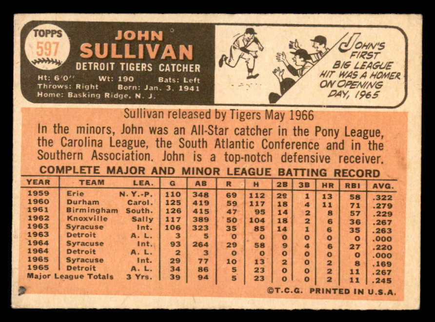 1966 Topps Baseball #597 John Sullivan Tigers VG-EX 544545