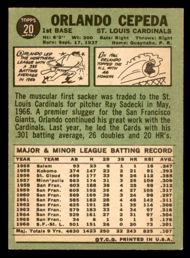 1967 Topps Baseball #020 Orlando Cepeda Cardinals EX-MT 540972