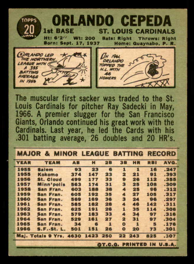 1967 Topps Baseball #020 Orlando Cepeda Cardinals EX-MT 543273