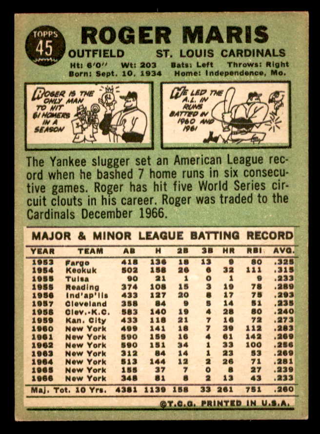 1967 Topps Baseball #045 Roger Maris Cardinals EX 539230