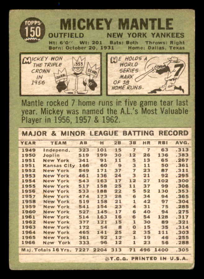 1967 Topps Baseball #150 Mickey Mantle Yankees VG 541749