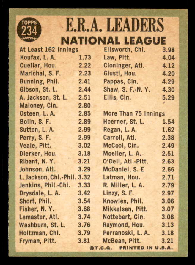 1967 Topps Baseball #234 N.L. ERA Leaders Sandy Koufax EX-MT 543275