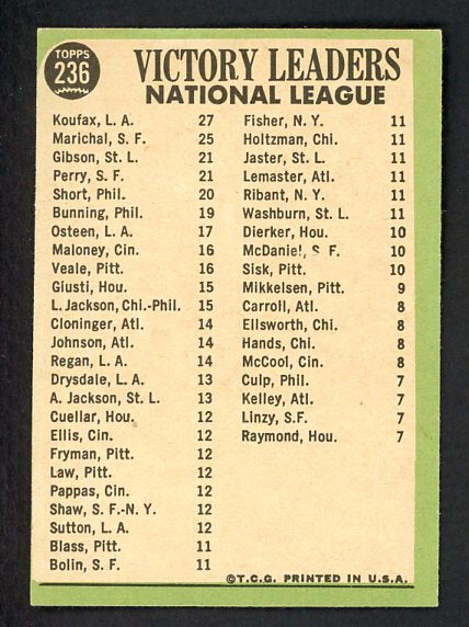 1967 Topps Baseball #236 N.L. Win Leaders Sandy Koufax EX-MT 530905
