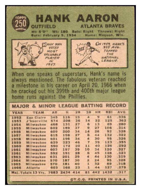 1967 Topps Baseball #250 Hank Aaron Braves VG 511313