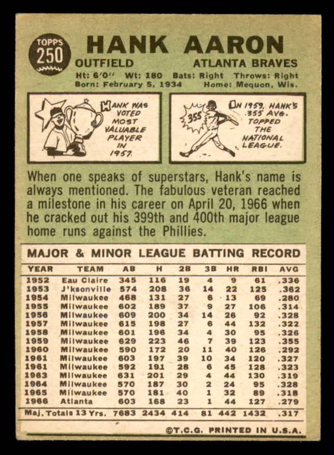 1967 Topps Baseball #250 Hank Aaron Braves VG 540982