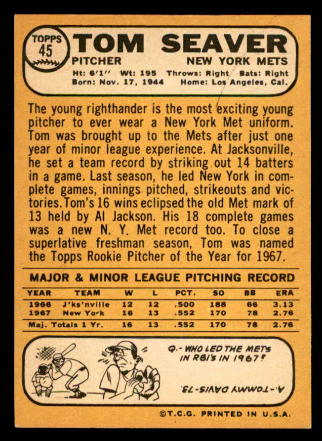 1968 Topps Baseball #045 Tom Seaver Mets NR-MT 539252