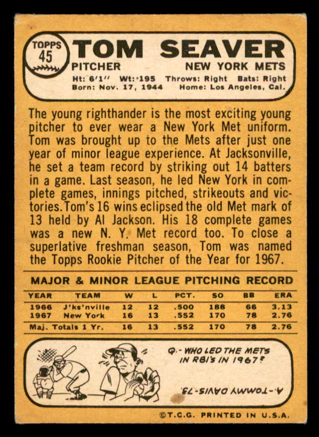 1968 Topps Baseball #045 Tom Seaver Mets VG 541070