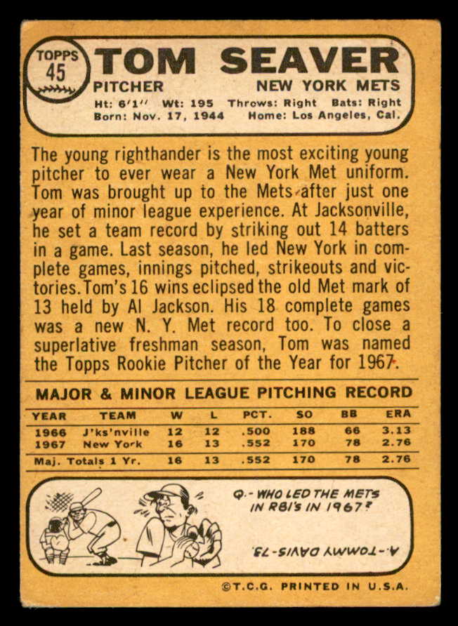 1968 Topps Baseball #045 Tom Seaver Mets VG-EX 539253