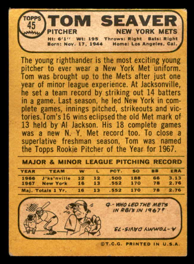 1968 Topps Baseball #045 Tom Seaver Mets VG-EX 539257